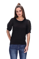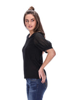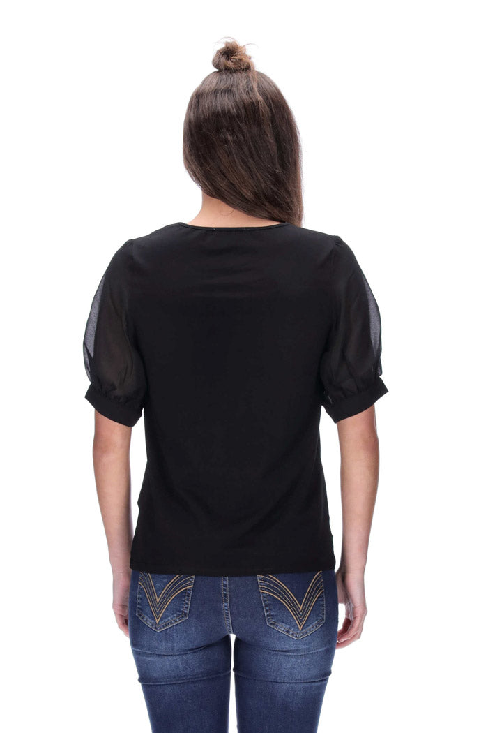 Features: Balloon chiffon sleeves with a cuff on the end, straight hemline and binded neckline