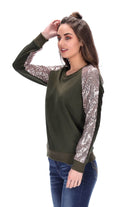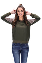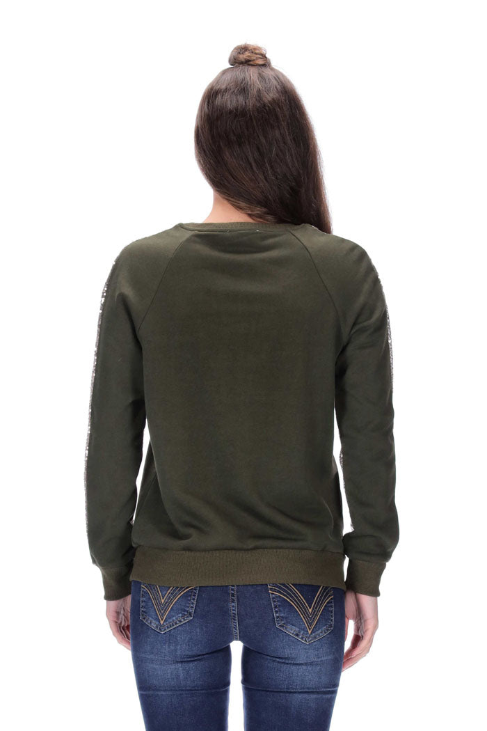 Sweater with raglan seam sleeves, sequin on the front half of sleeves and chunky ribbing on hems