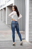 Mid-rise dark blue stretch denim with rips and a heavy stonewash