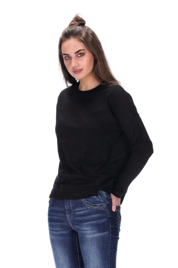 Features: Textured fabric with drop shoulders, angled side seam, thick hem band and small splits on the front