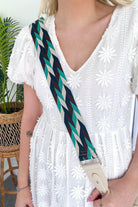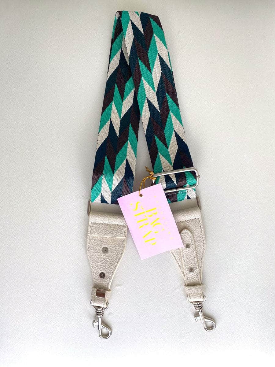 A fun abstract print adjustable woven bag strap with faux leather, and silver hardware clasps