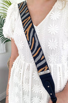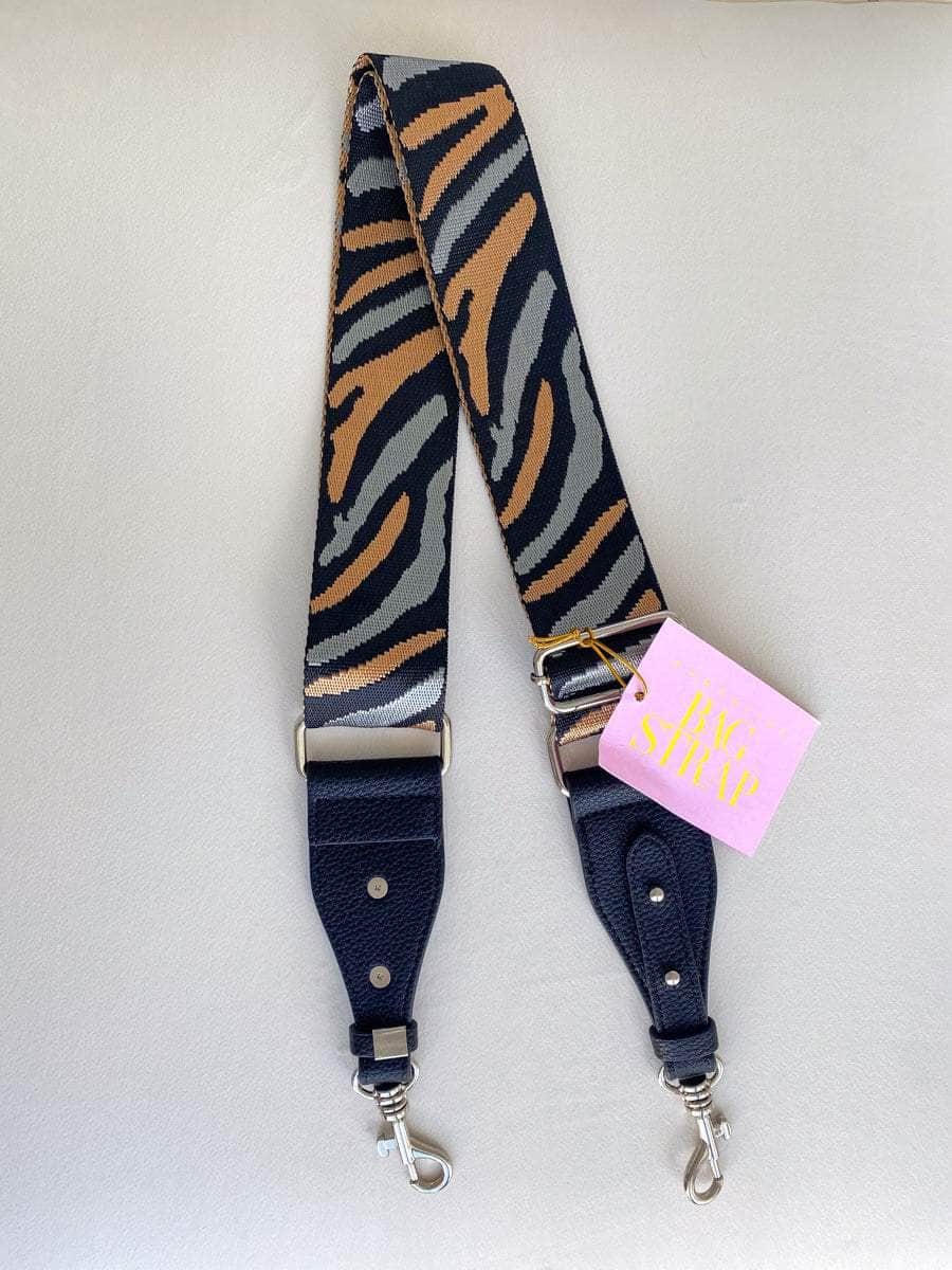 A grey and beige zebra print adjustable woven bag strap with faux leather, and silver hardware clasps