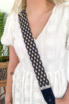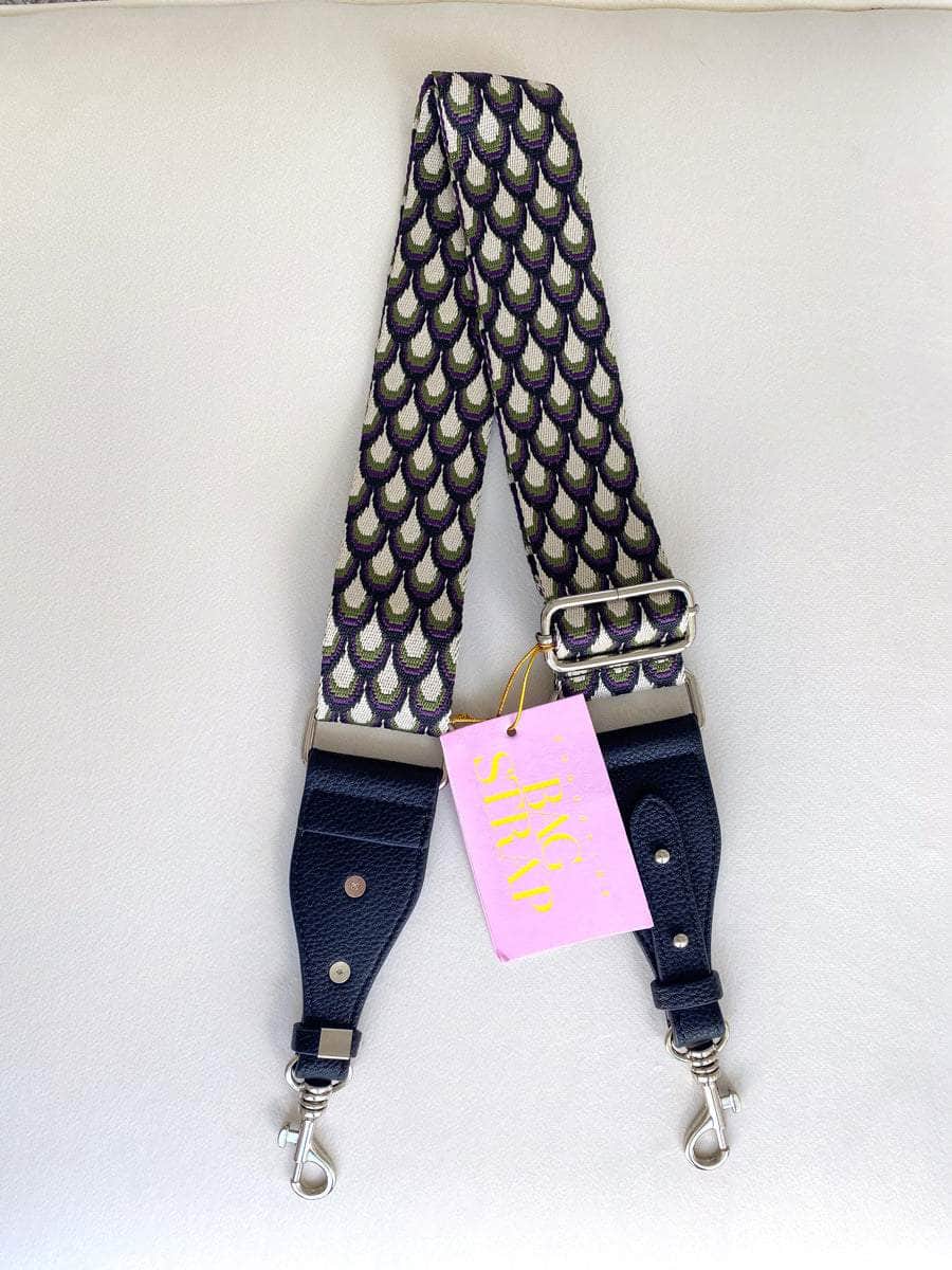 A scalloped design adjustable woven bag strap with faux leather, and silver hardware clasps