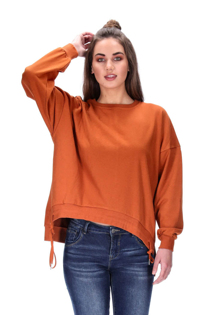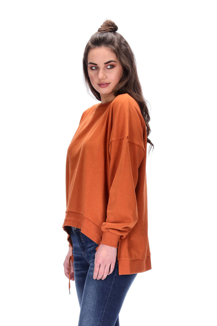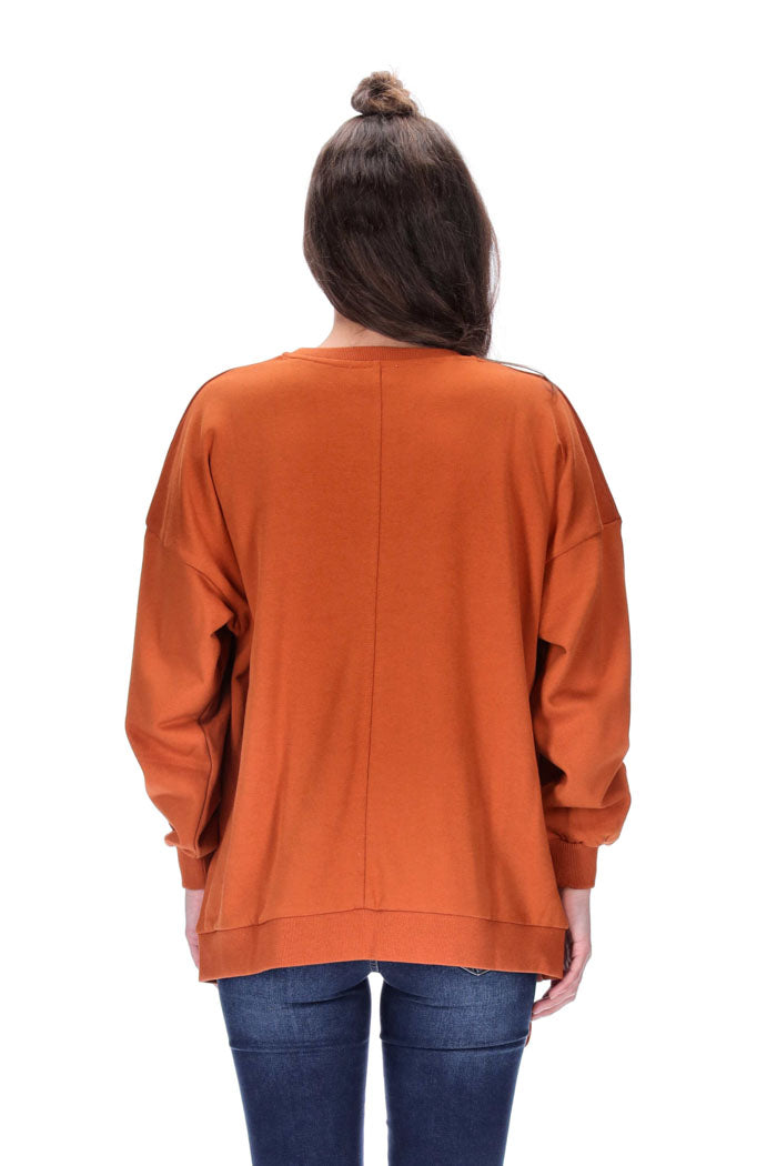 Features: A relaxed sweater with dropped shoulders, centre back seam, dipped back hem, and chunky ribbed trim