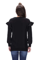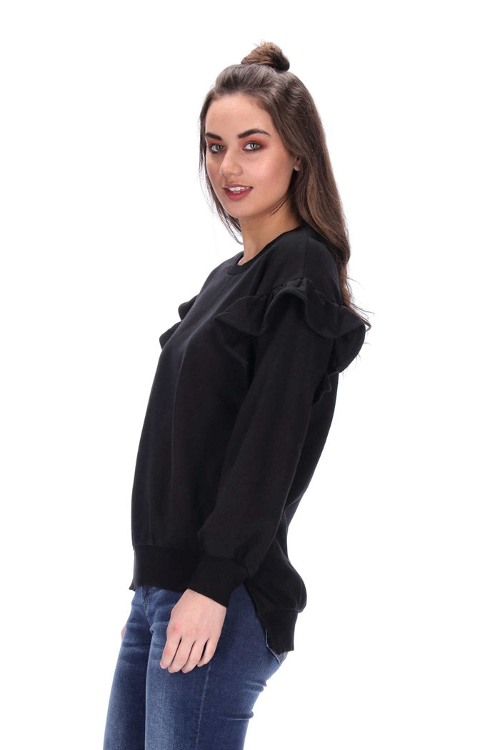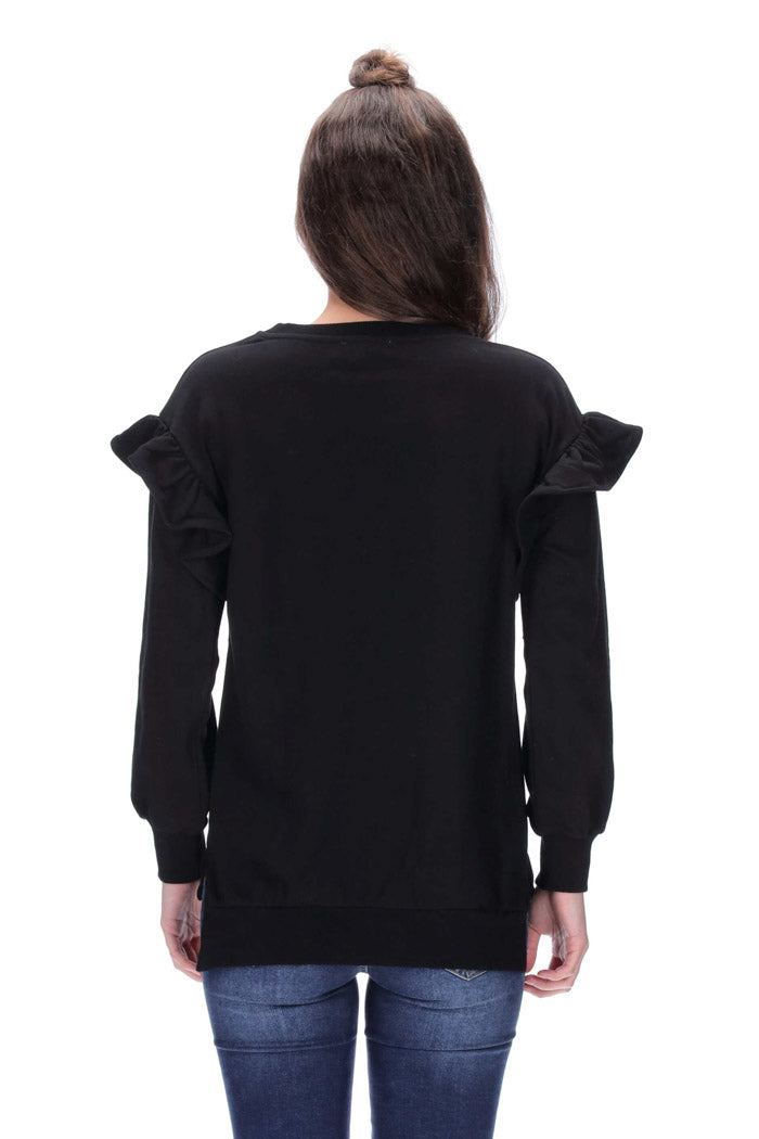 Features: Dropped shoulders with ruffles, long sleeves and dipped hem band