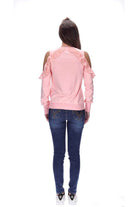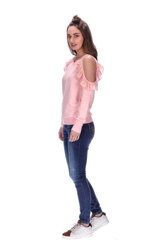Features: Classic sweater with shoulder cutouts and chiffon ruffles