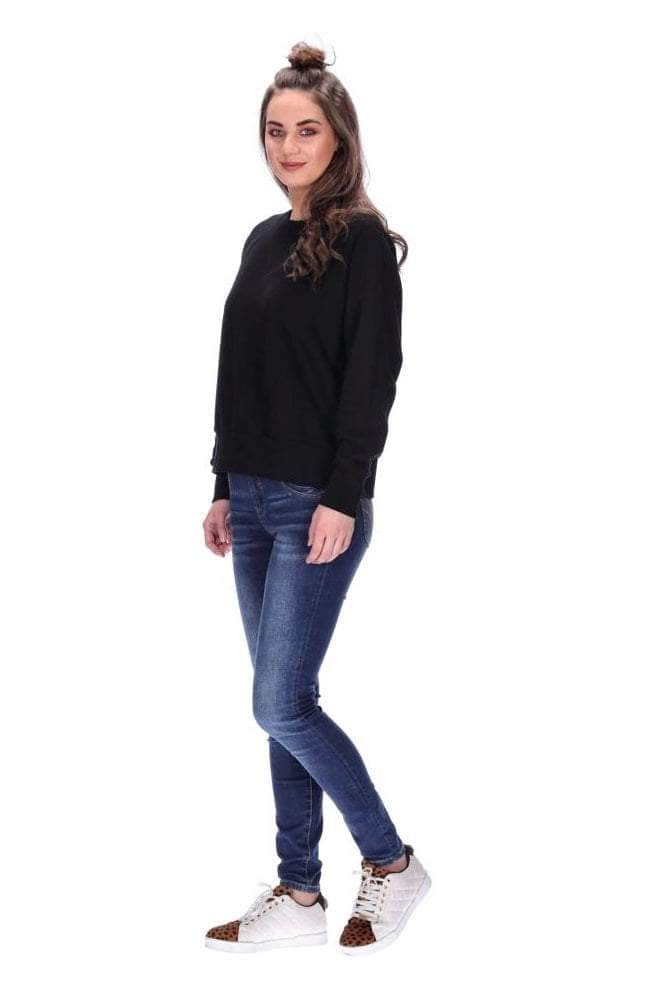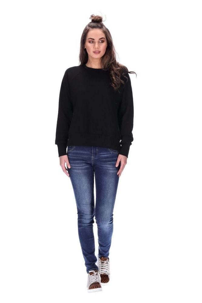 Features: Raglan sleeve sweater with side splits, ribbed neckline, chunky cuffs and hemband
