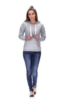 Features: Grey marle hoodie with silver eyelets, chunky white grosgrain drawstring, kangaroo pocket,  ribbing on hems and navy striped lined hood