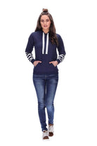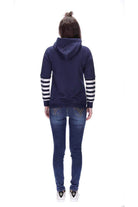 Features: Navy hoodie with lightweight striped sleeve panels, kangaroo pocket, chunky hem bands and white grosgrain hoodie drawstring