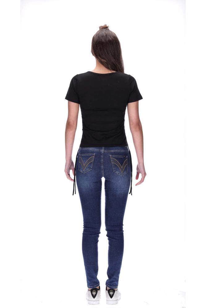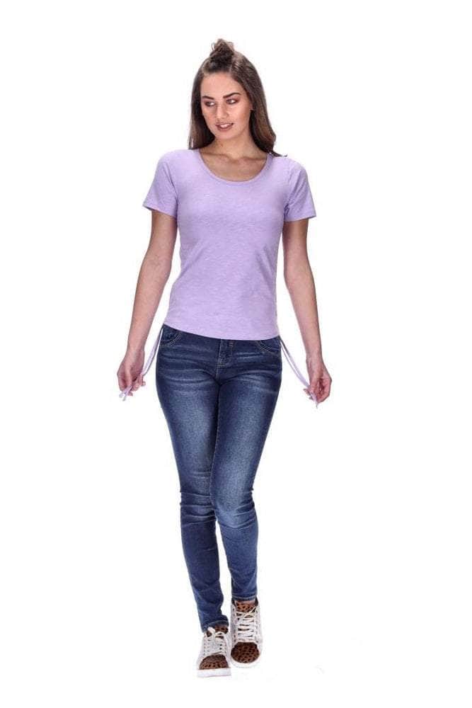 Features: Stretchy knit short sleeve top with draw tie binding at side seams