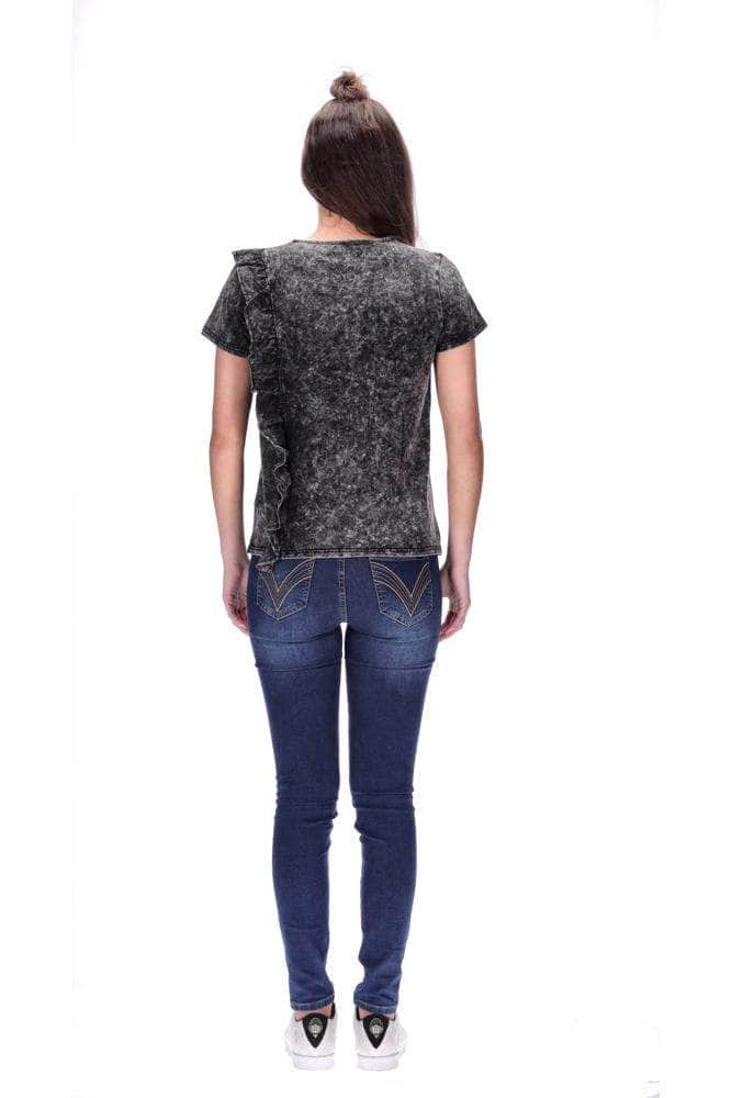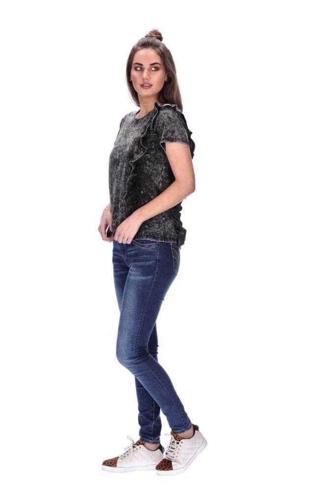 T-Shirt Features: Scoop neck, straight hemline with a gorgeous ruffle running down one side