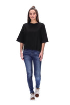 Features: Elbow length sleeves, textured fabric, dropped shoulder, small side splits, slightly longer on back, straight hemline