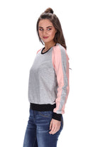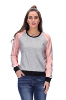 Features: Sweater with raglan seams, contrast sleeve panels, pintucks running down the sleeves and a ribbed black neckline, cuff and hem band