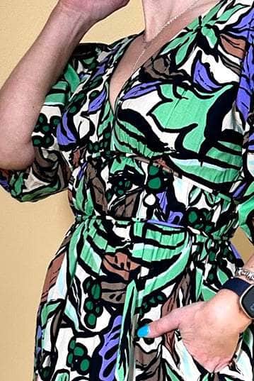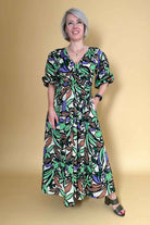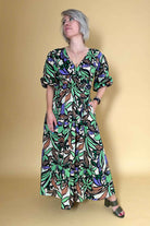 A V neck green abstract print maxi dress.