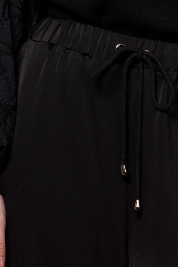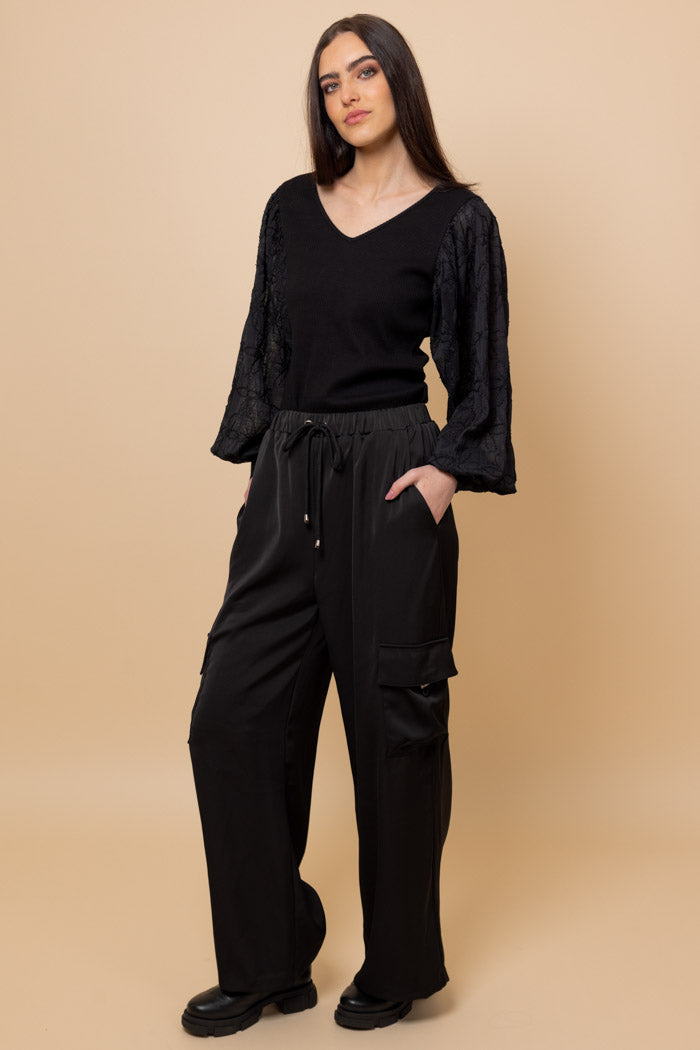 A satin wide leg black cargo style pant.