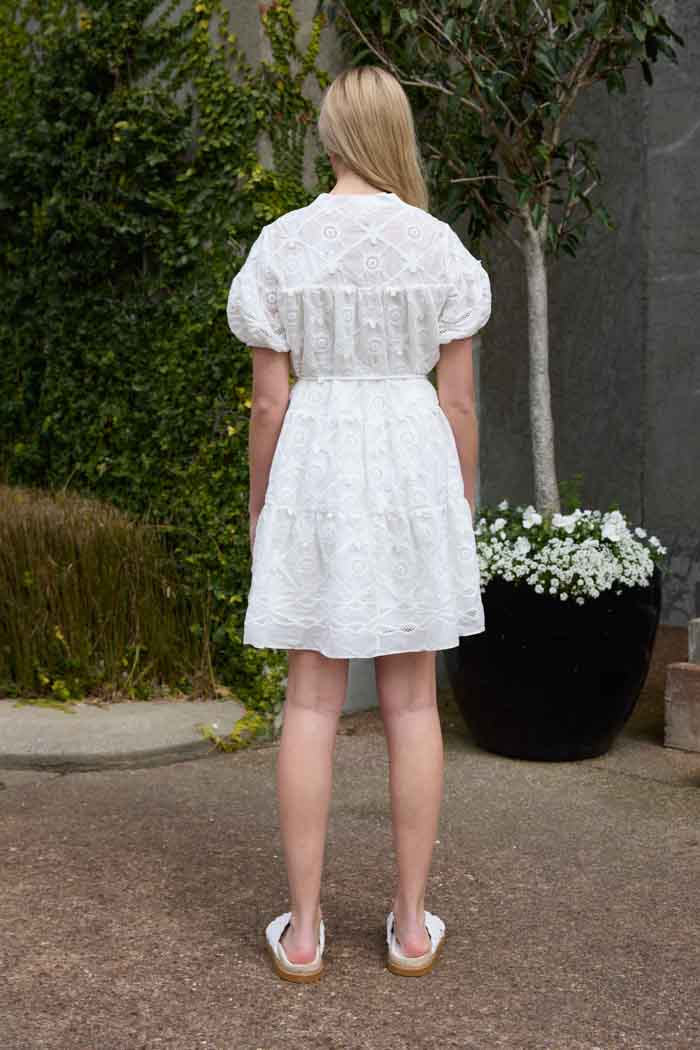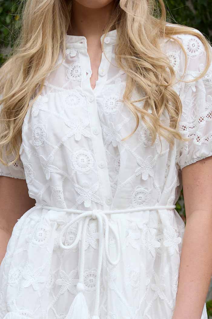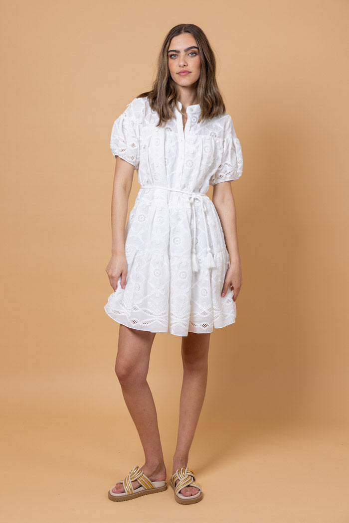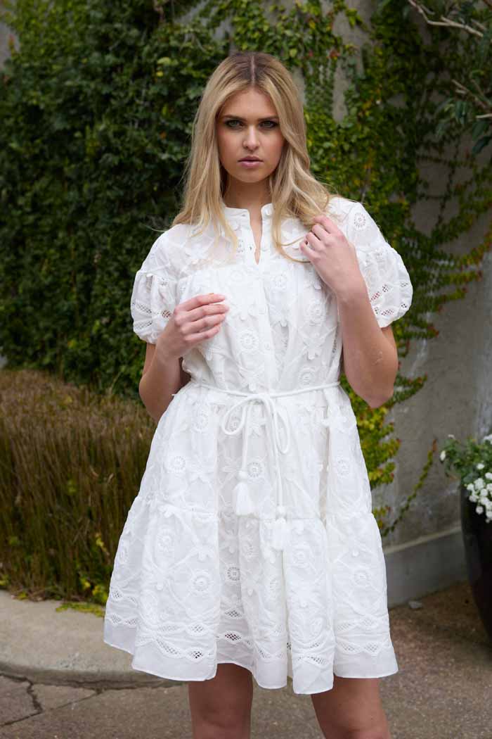 A soft white embroidered mini dress with a puff sleeve and waist tie.
