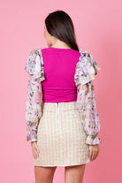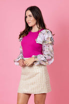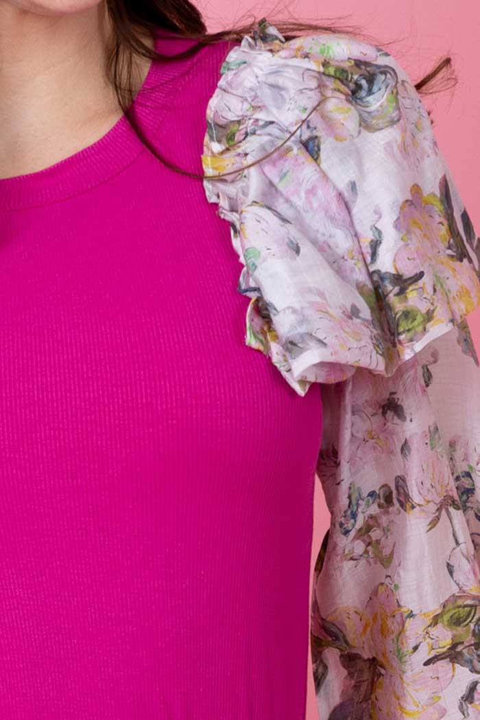 A hot pink ribbed top with floral print sleeves.