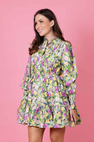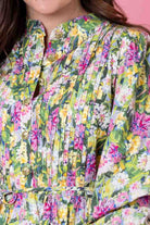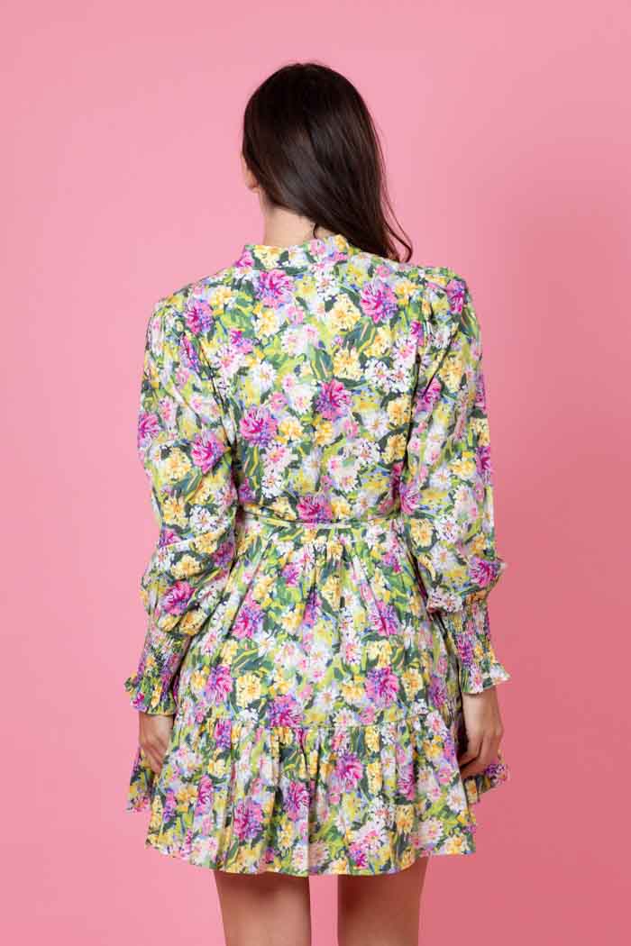 A green & pink floral print mini shirt dress.