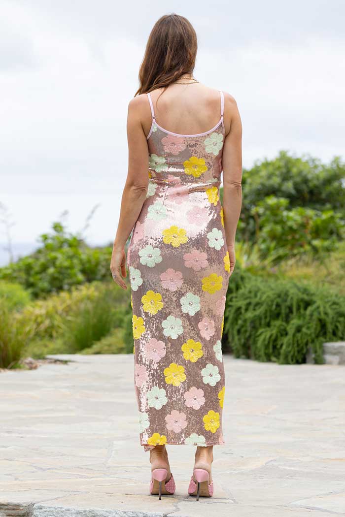 A rose gold floral sequin maxi dress.