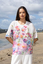 A floaty top in white with a colourful floral print.