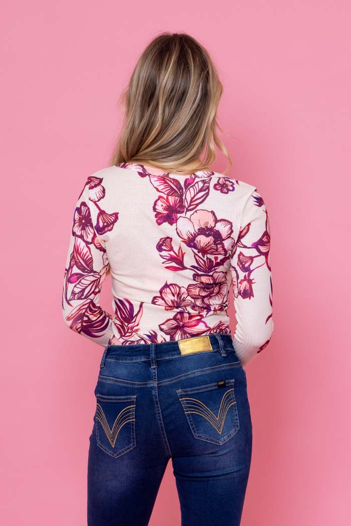 A cream floral print long-sleeve top.