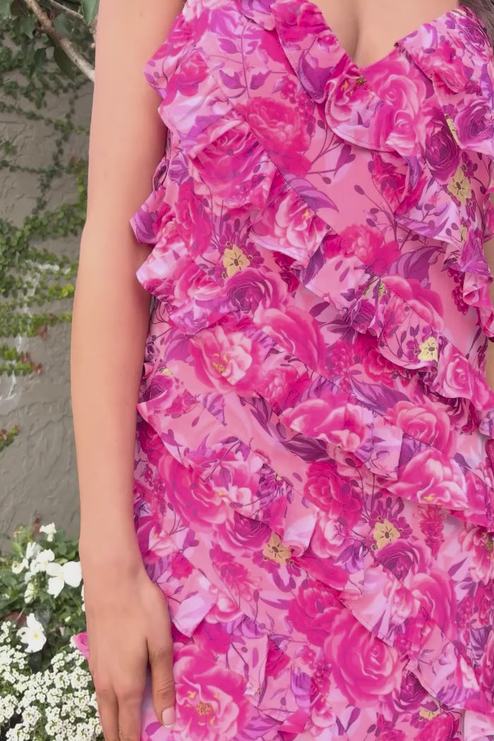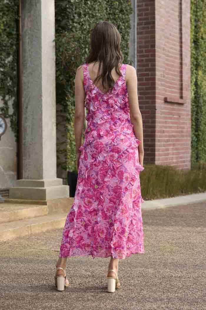 A soft pink ruffle bias cut pink floral dress.