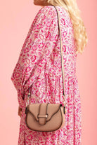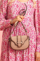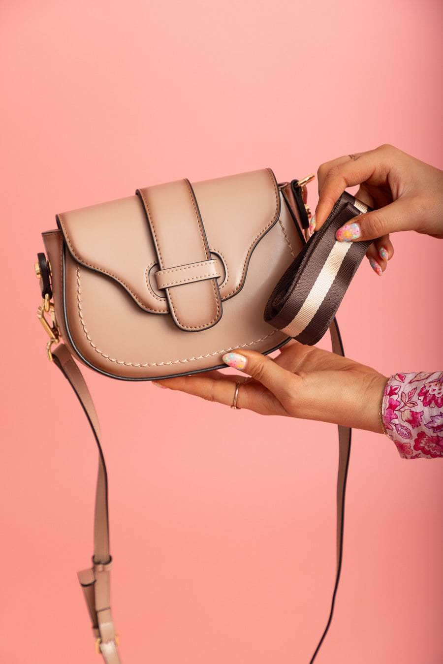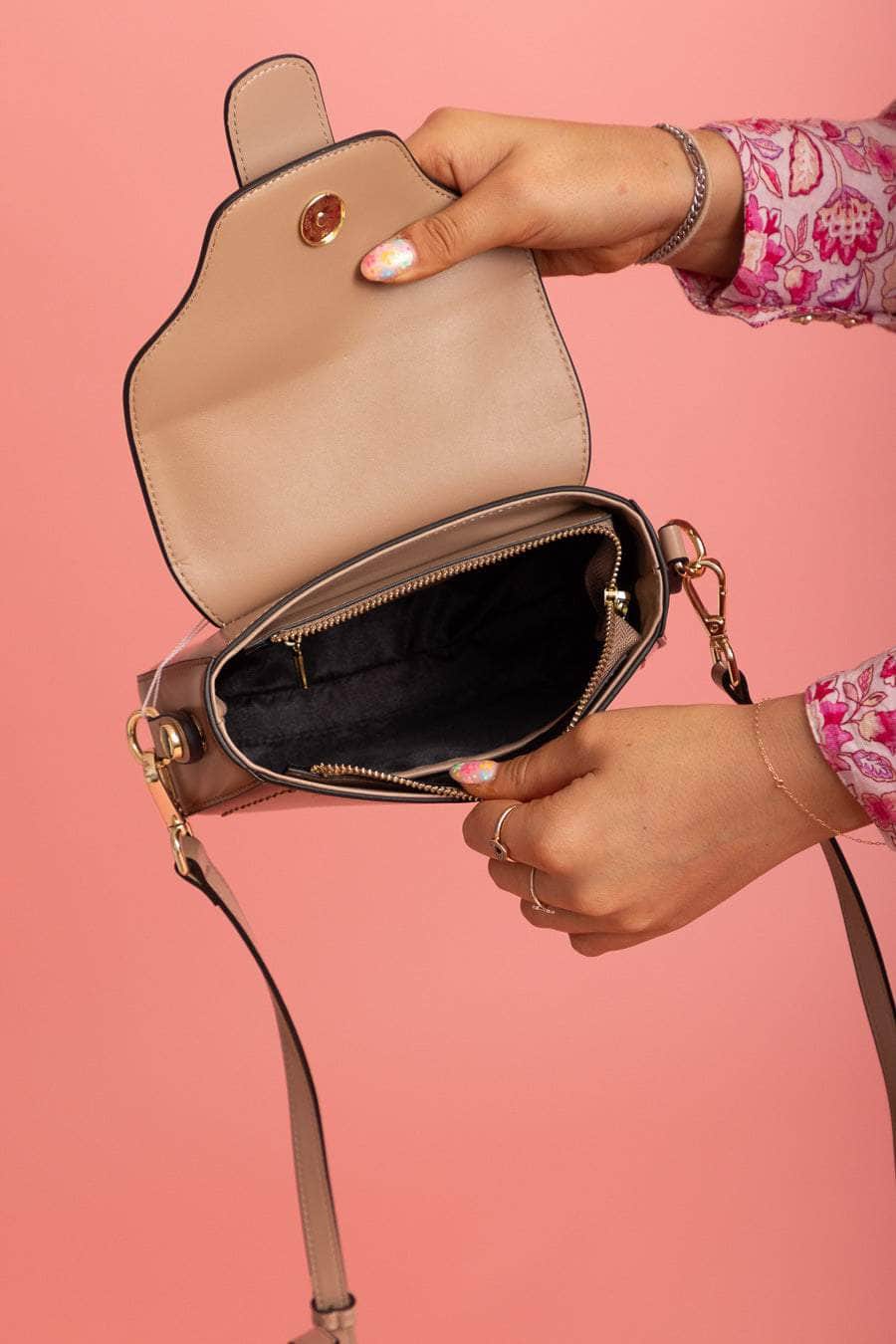 A small tan leather handbag with a magnetic flap, and a long shoulder strap.