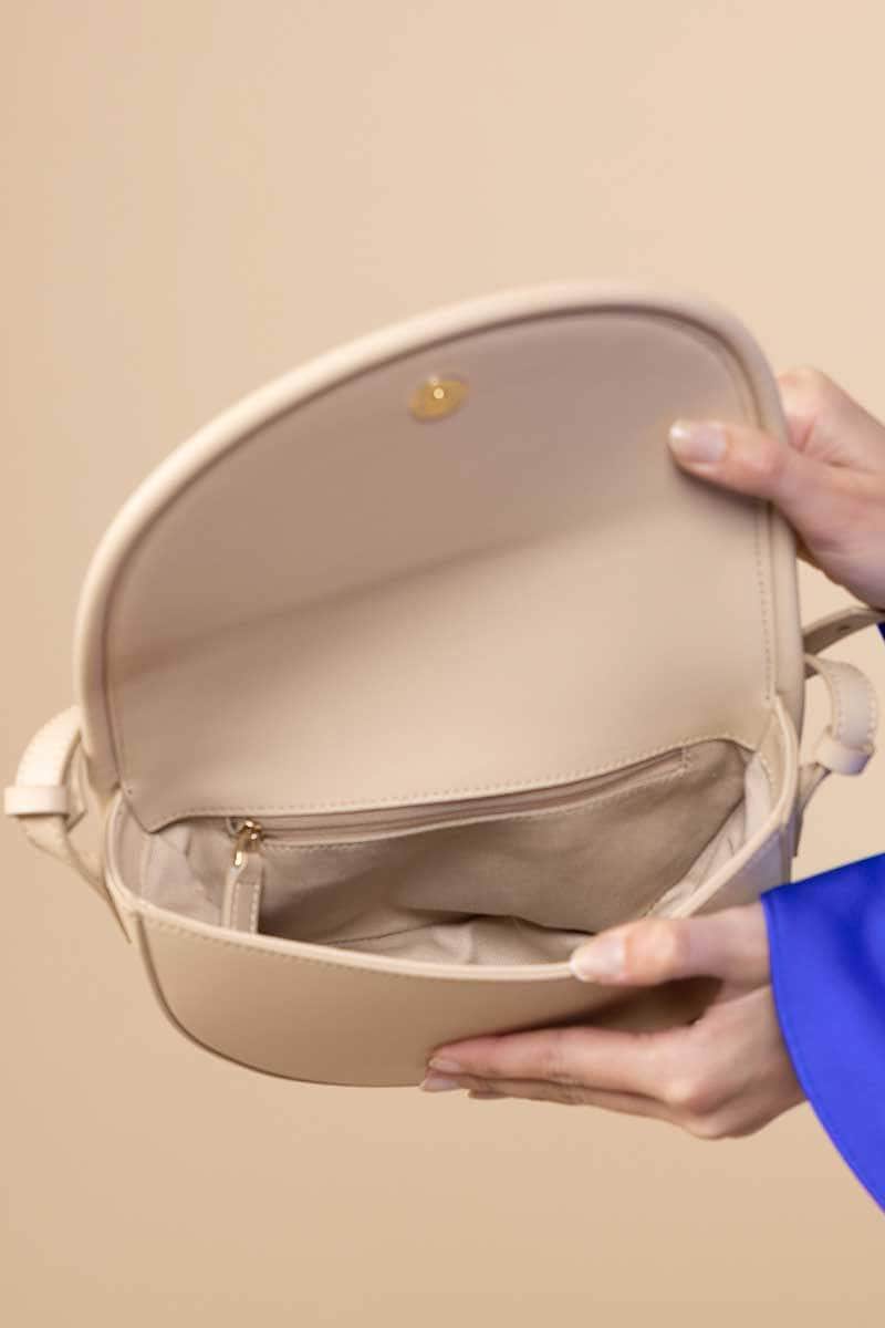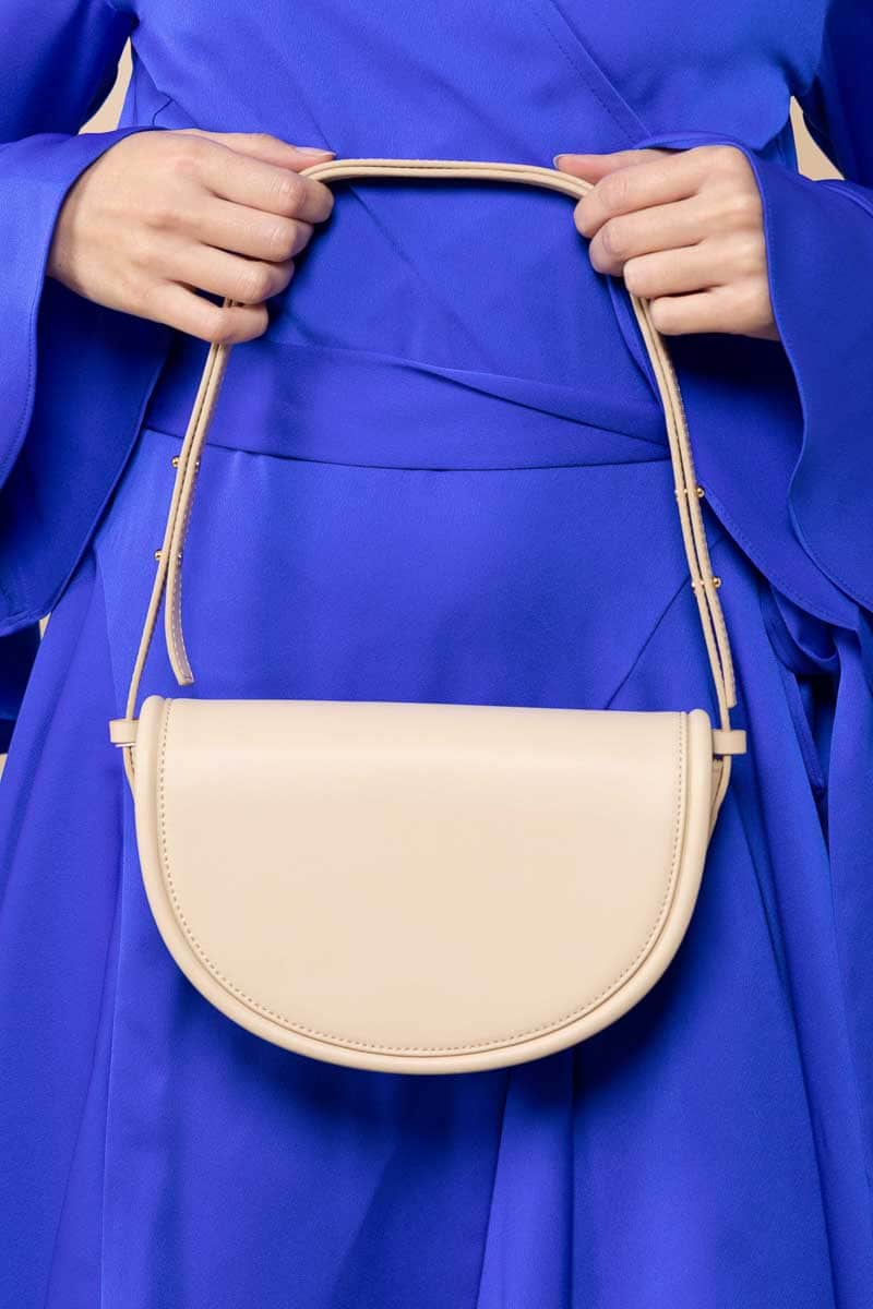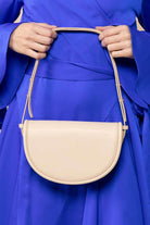 A curved beige leather handbag with a short shoulder strap.