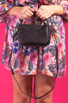 A small black leather handbag with a long shoulder strap.