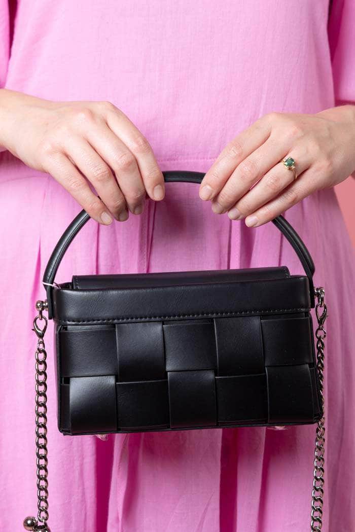 A small black leather woven handbag, with a chain shoulder strap.