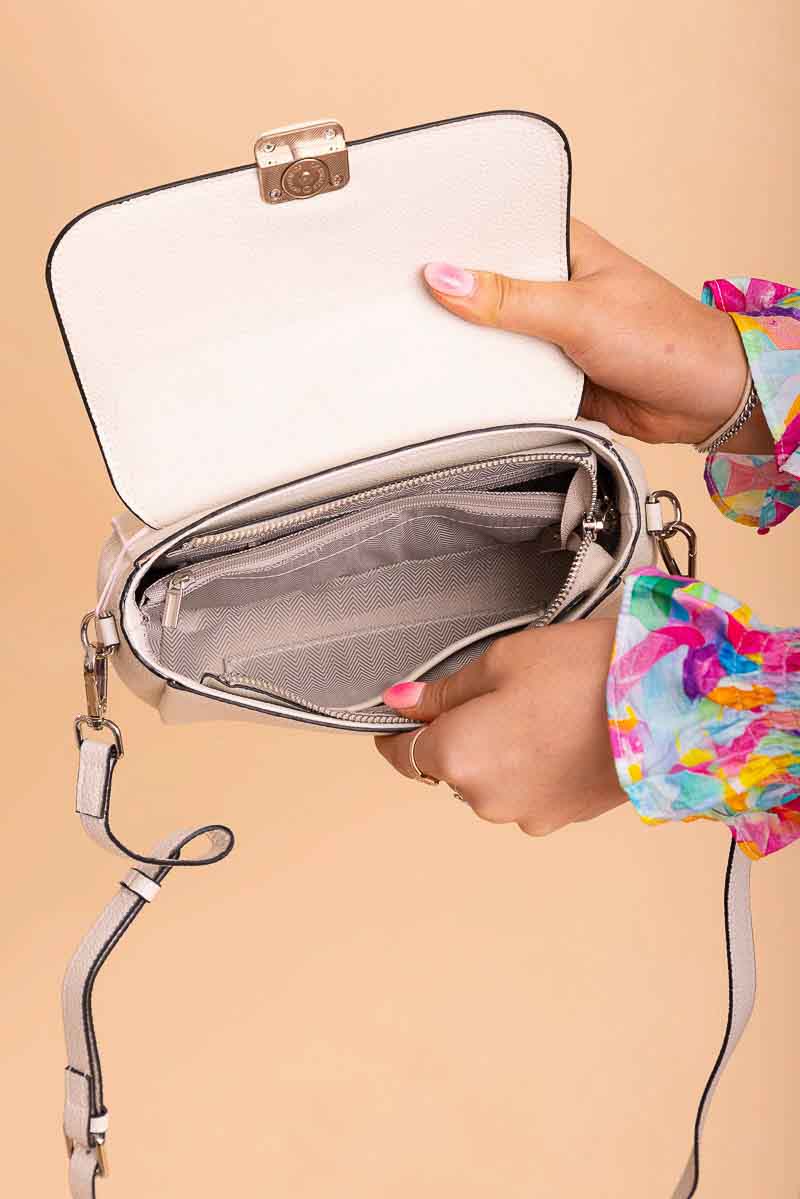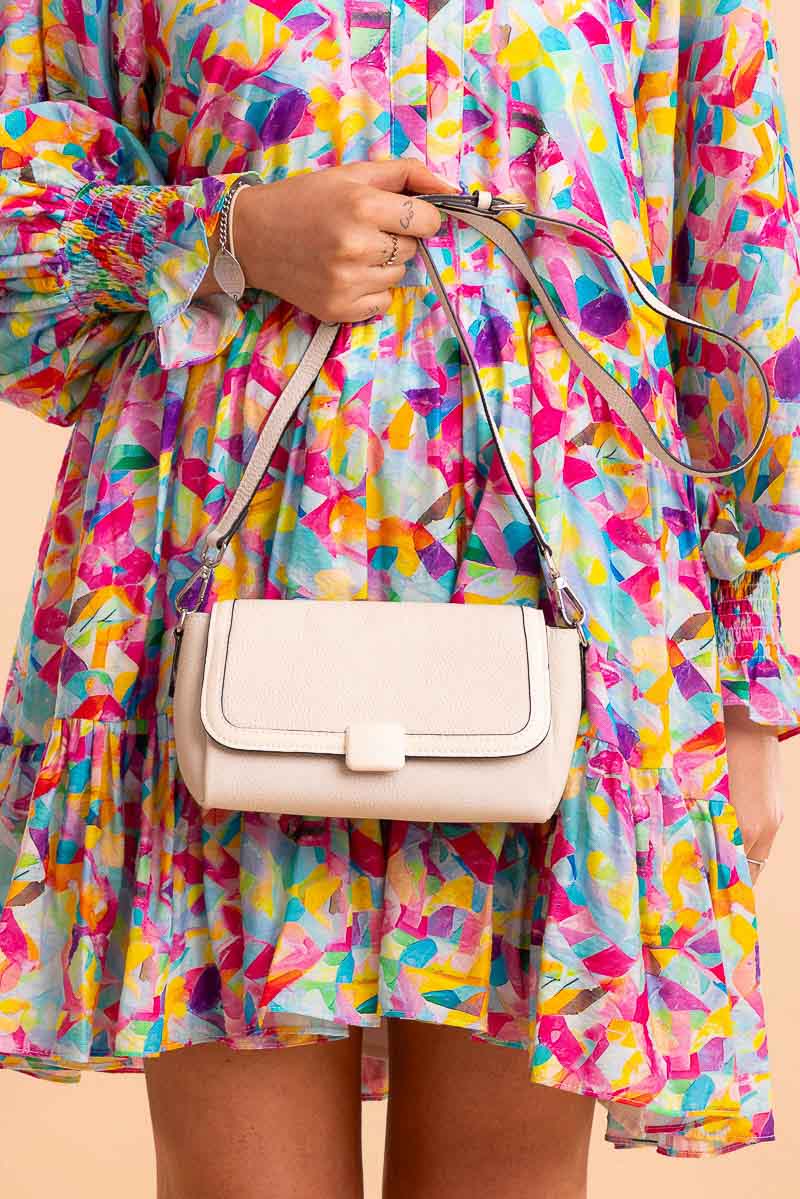 A small white rectangular leather handbag, with magnetic flap.