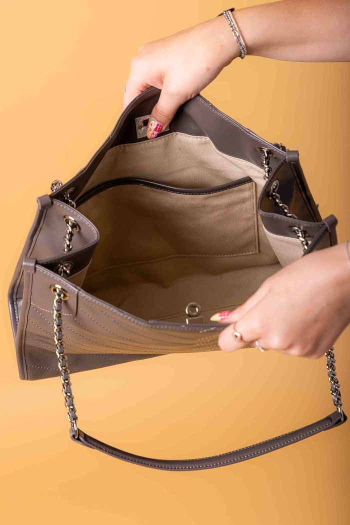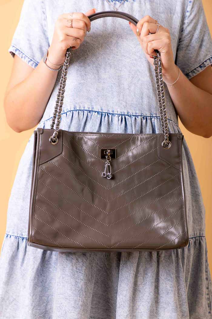 A large taupe leather tote handbag, with a chain shoulder strap.