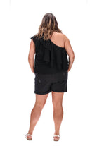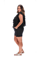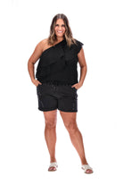 A lovely black denim short with an elasticated waist, side & back pockets, faux fly zip stitching, a white drawstrin tie, and cuffed hem.