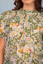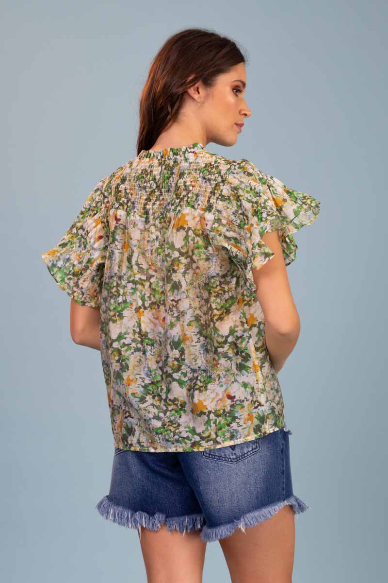 A green floral print blouse with pintucked sleeves.