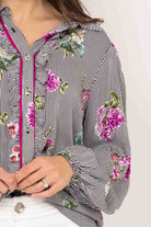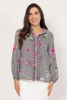 A soft black and white thin striped shirt with soft floral design and pink.