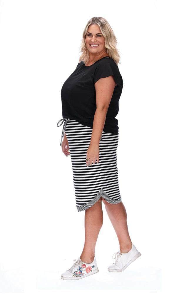 Such a great shape knee length skirt featuring elasticated drawstring waist, side pockets, and shaped hem with contrast stripe detail.