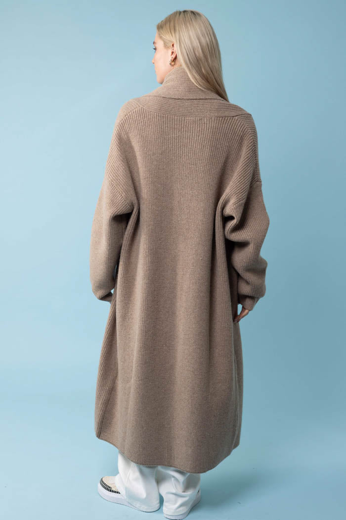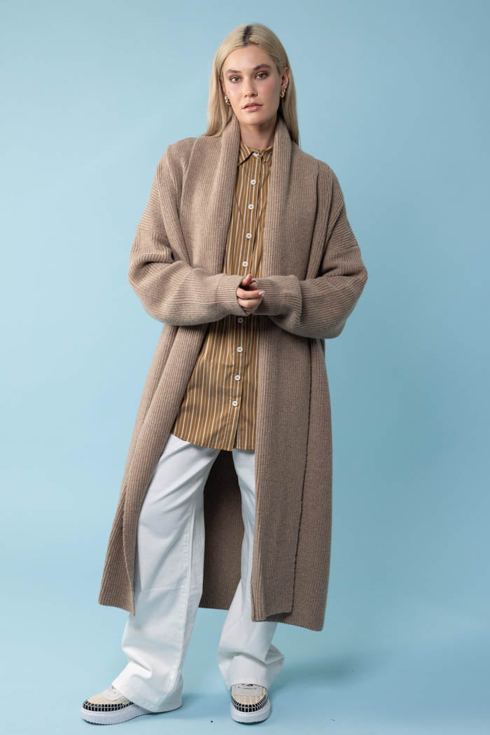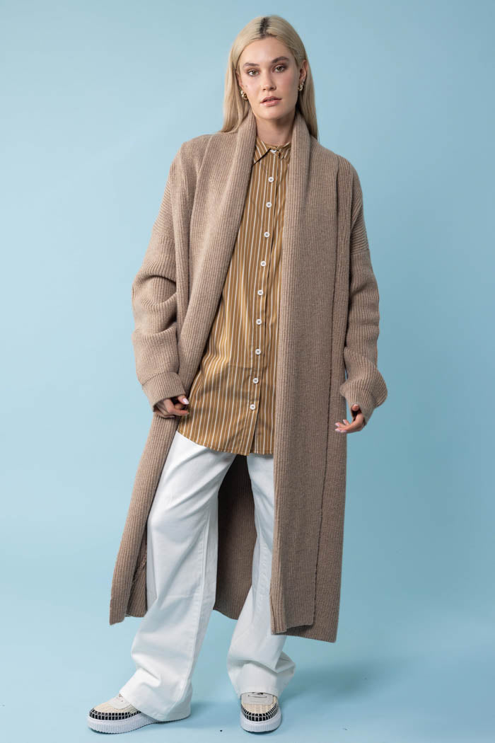 A caramel long knit cardigan.