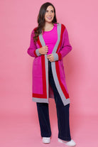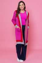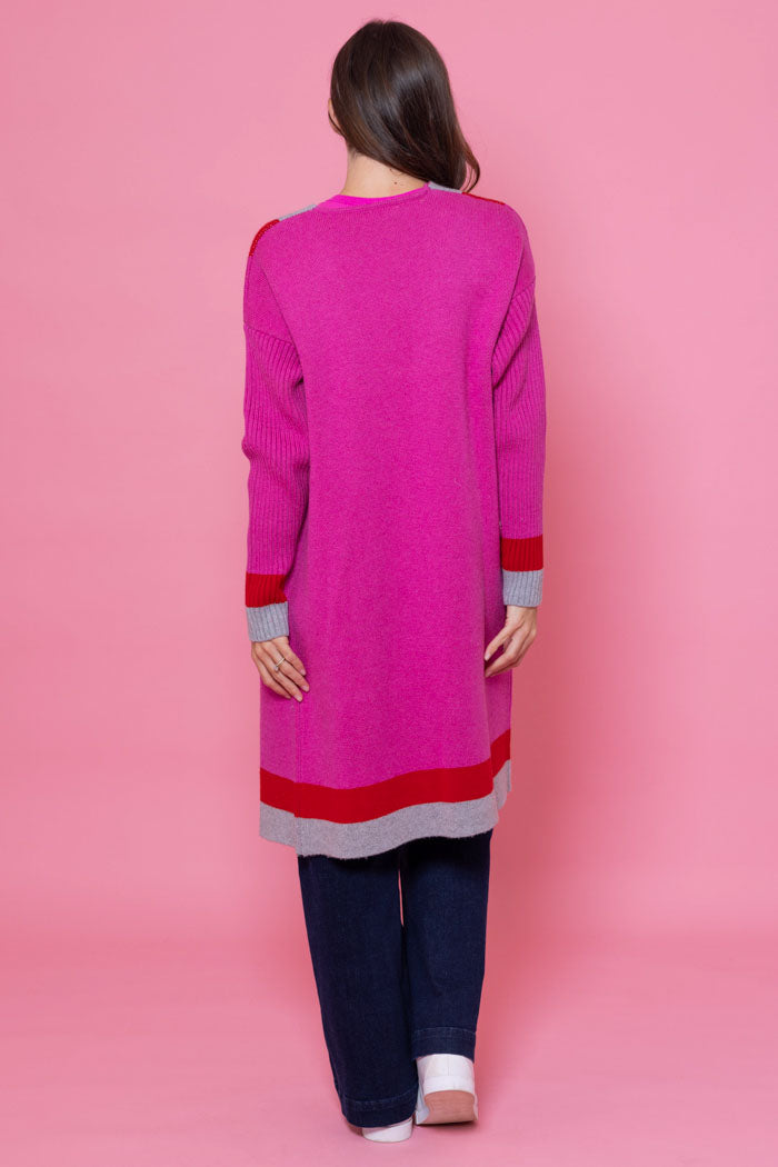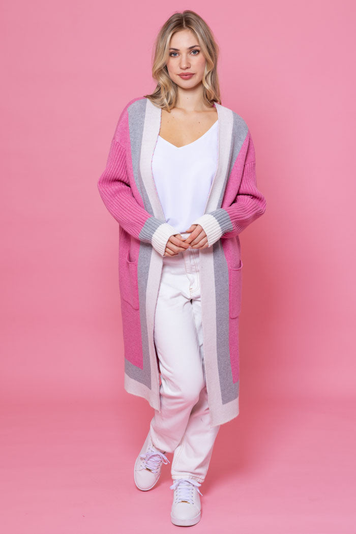 A soft baby pink long cardigan with a grey and white stripe detail.