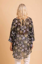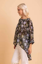 A black floral print batwing sleeve top.