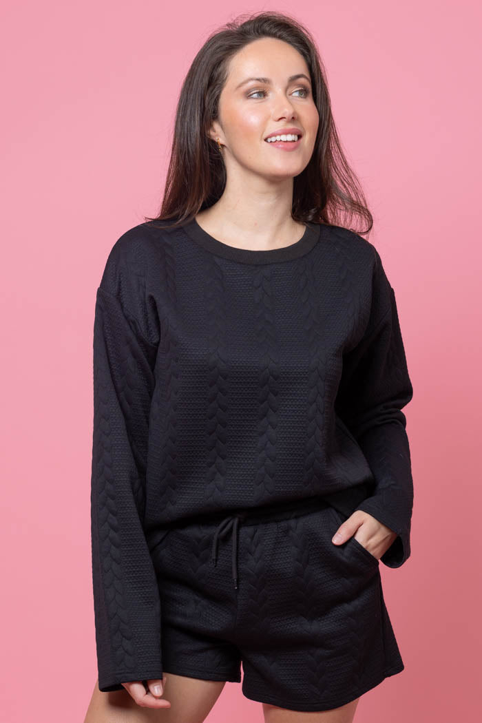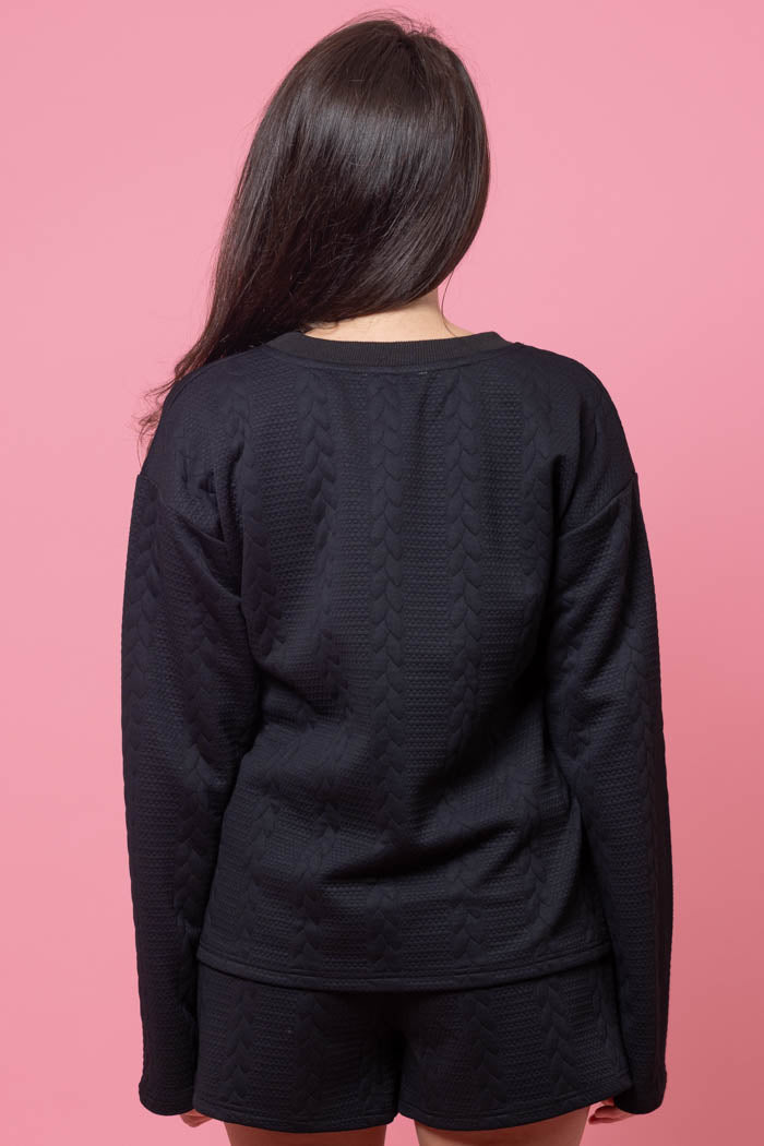 A solid black embossed fabric black sweater with wide arm and no cuff.