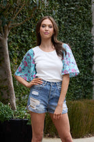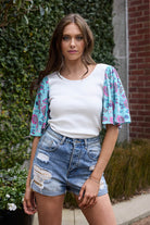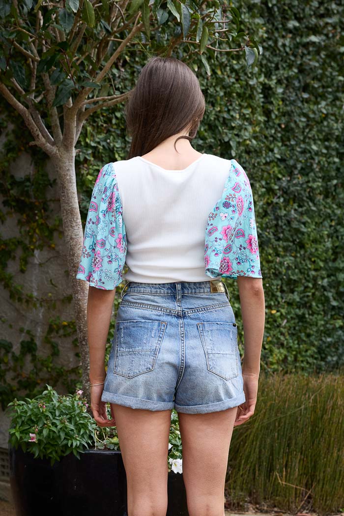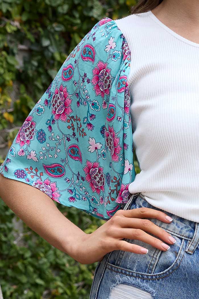 A soft ribbed t-shirt with a blue boho print sleeve.