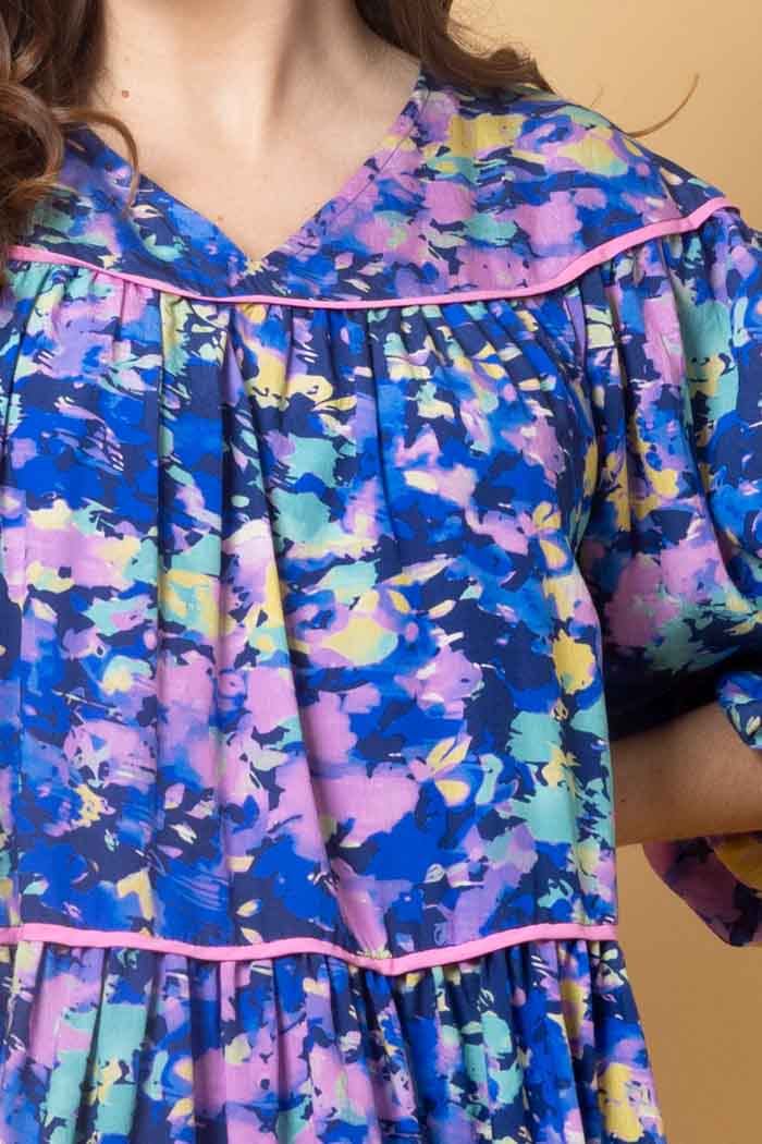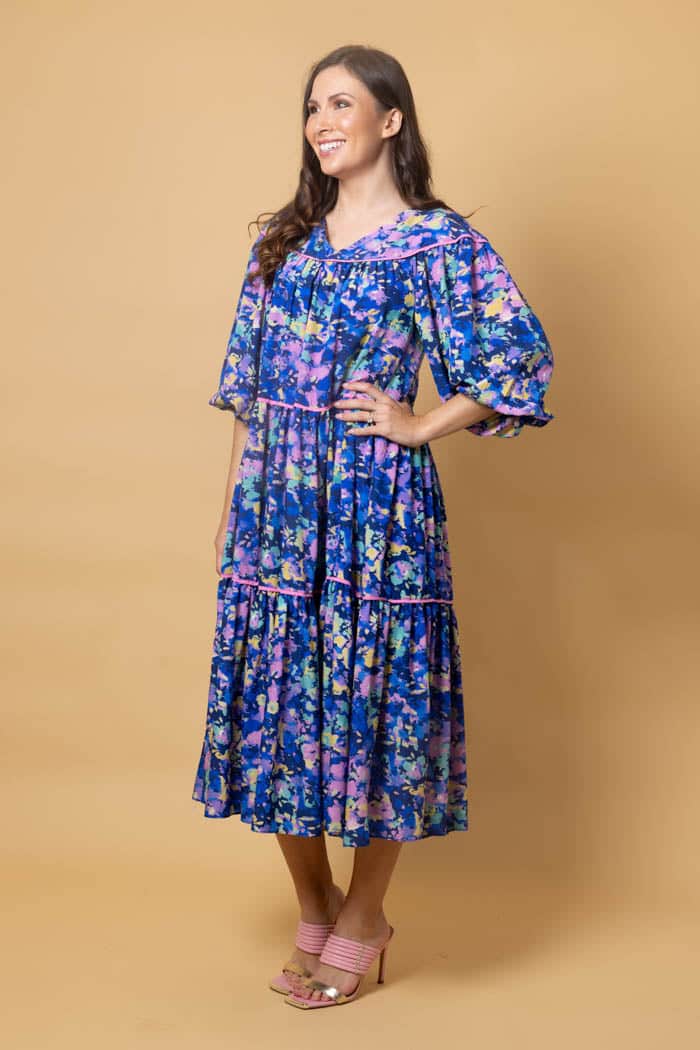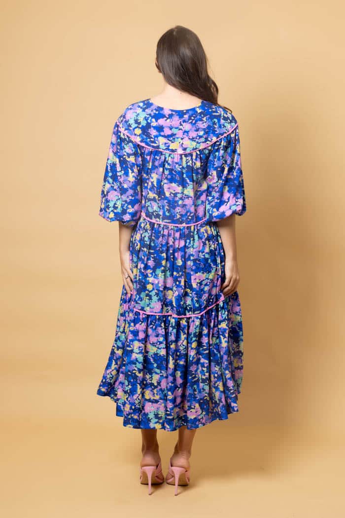 A blue abstract print tiered midi dress.