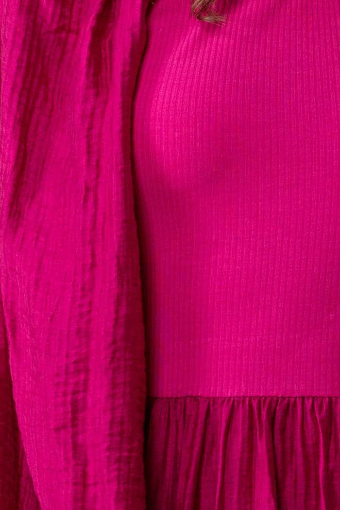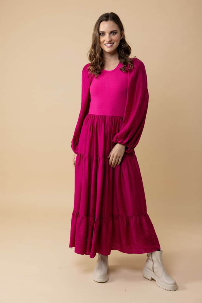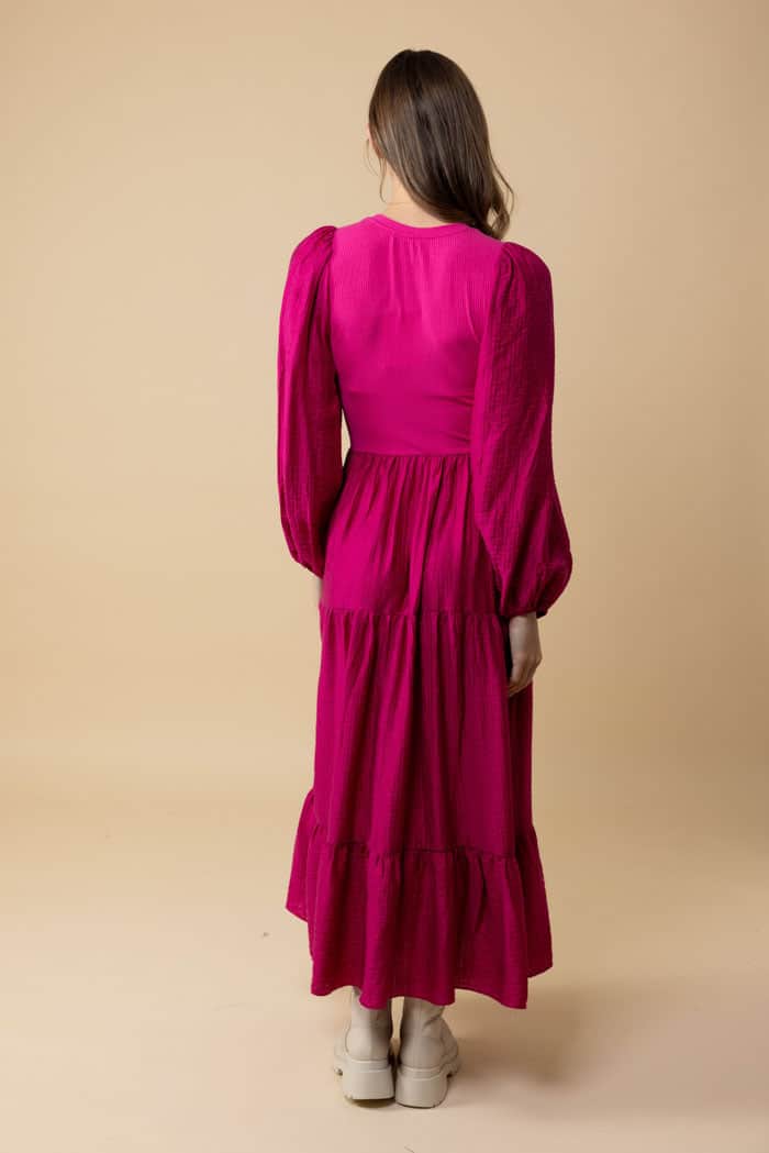A hot pink tiered maxi dress with a ribbed bodice.