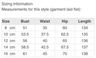 | Size | Bust | Waist | Hip | Length | |
