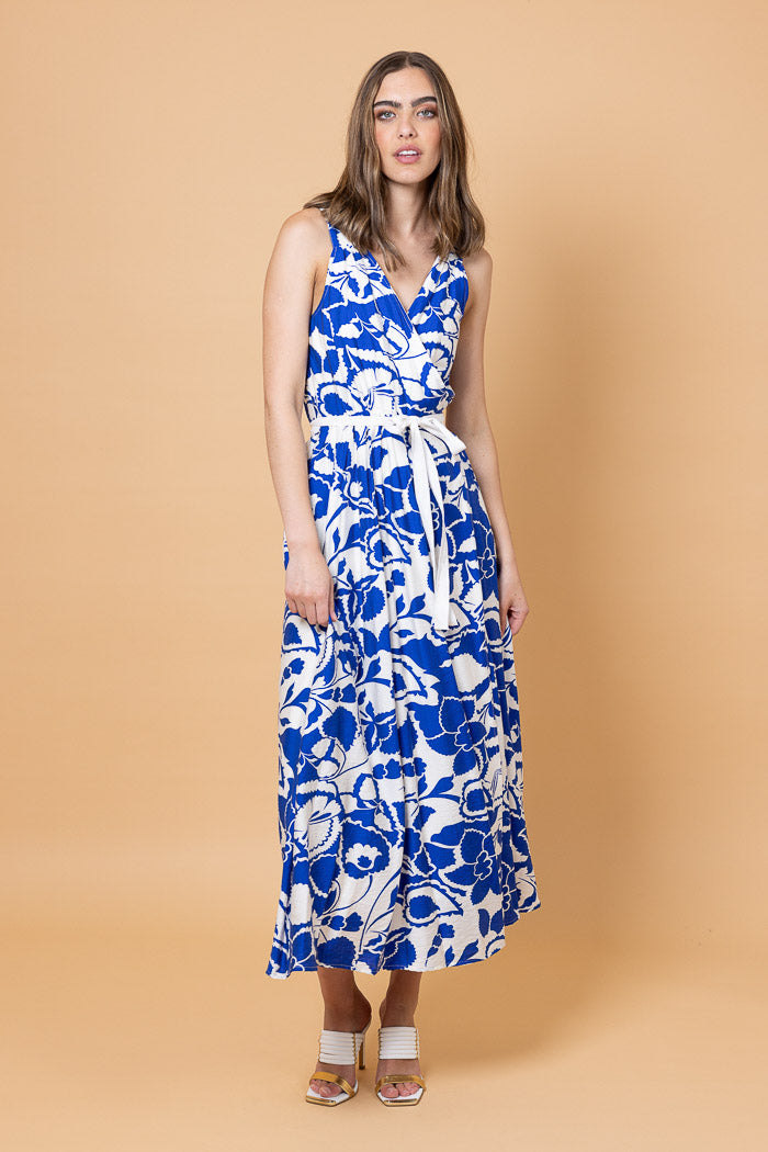 A blue and white print wrap style maxi dress.