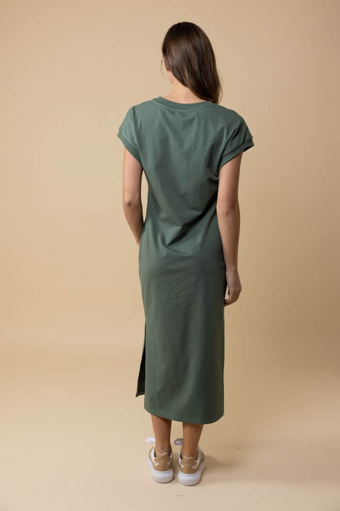 A khaki green jersey t-shirt midi dress.