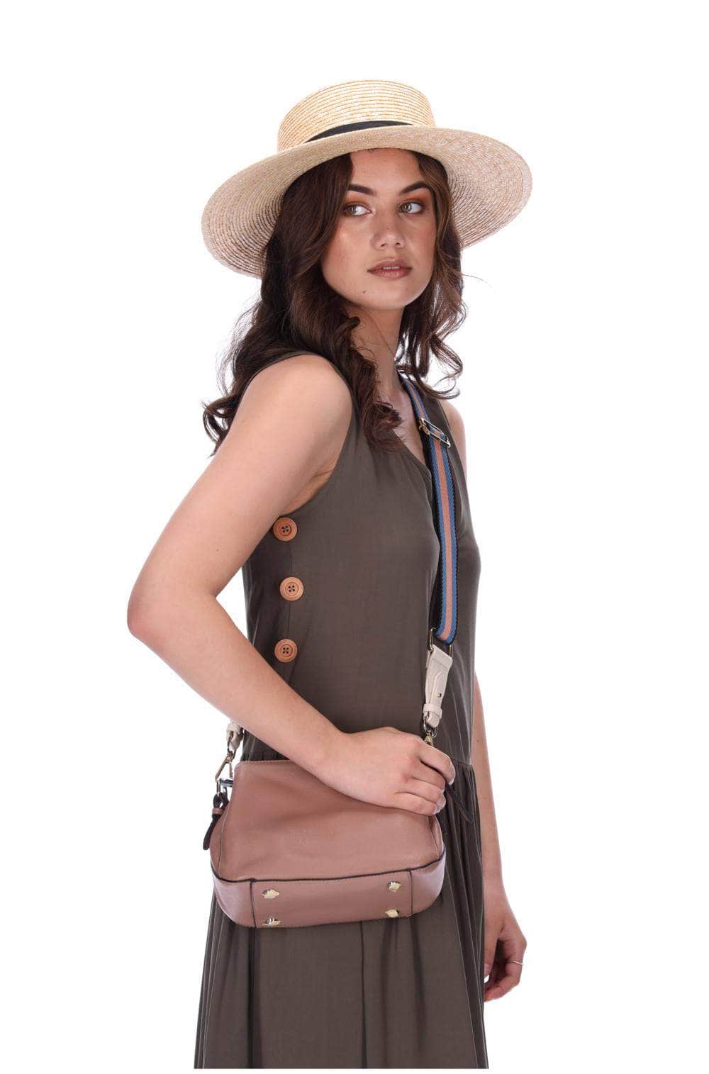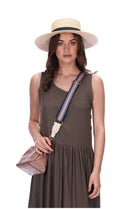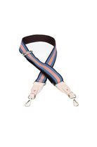 A blue striped adjustable woven bag strap with faux leather clasp ends