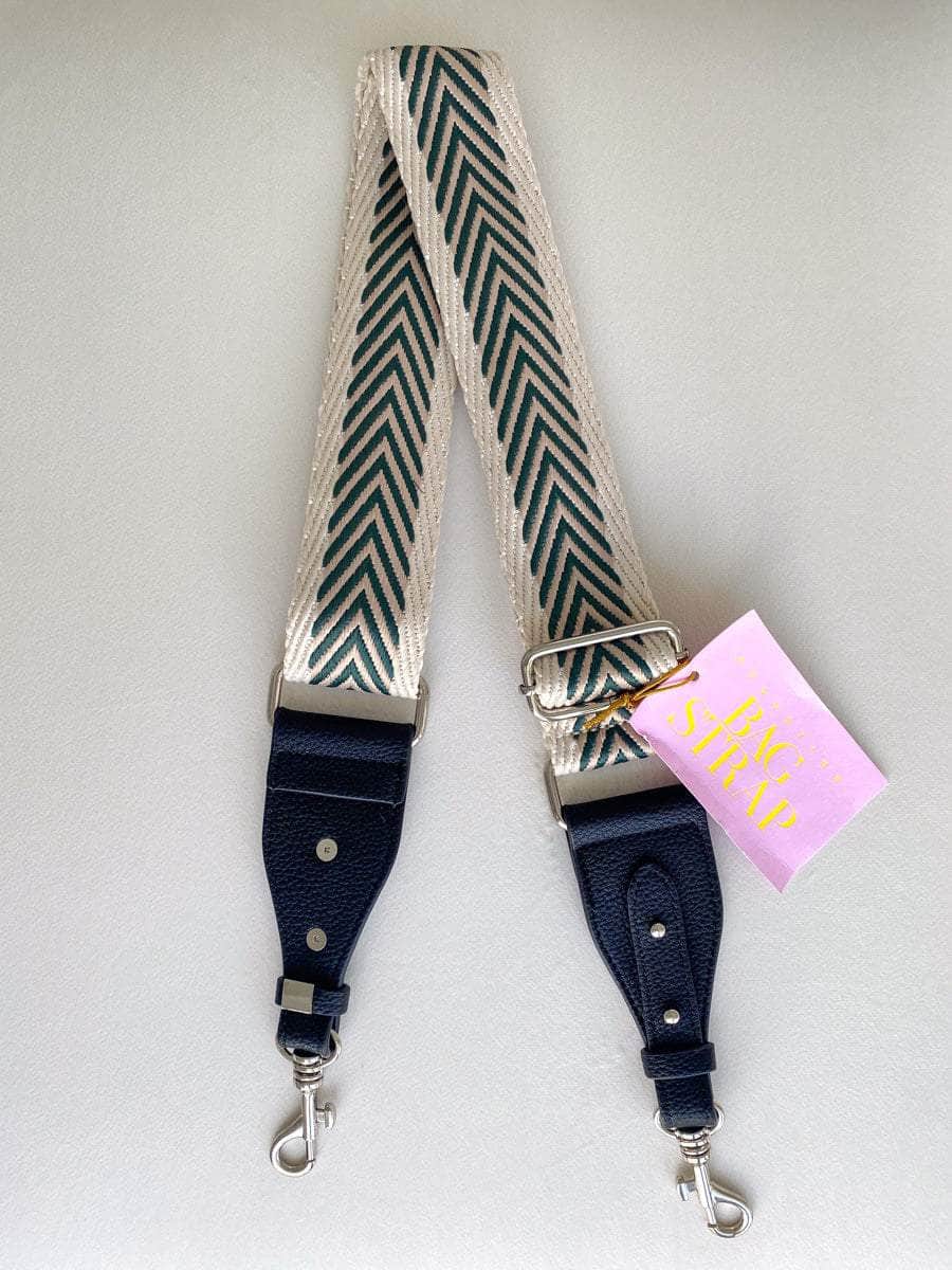 A gorgeous adjustable beige and green woven bag strap with faux leather, and silver hardware clasps