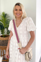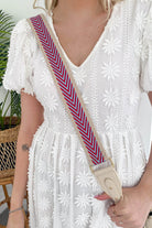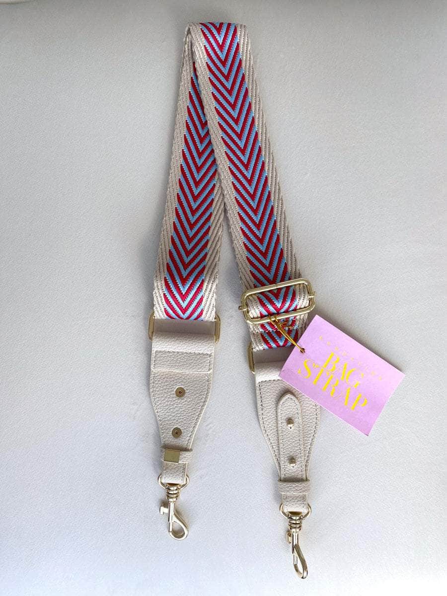 A gorgeous adjustable pink and blue woven bag strap with faux leather, and gold hardware clasps