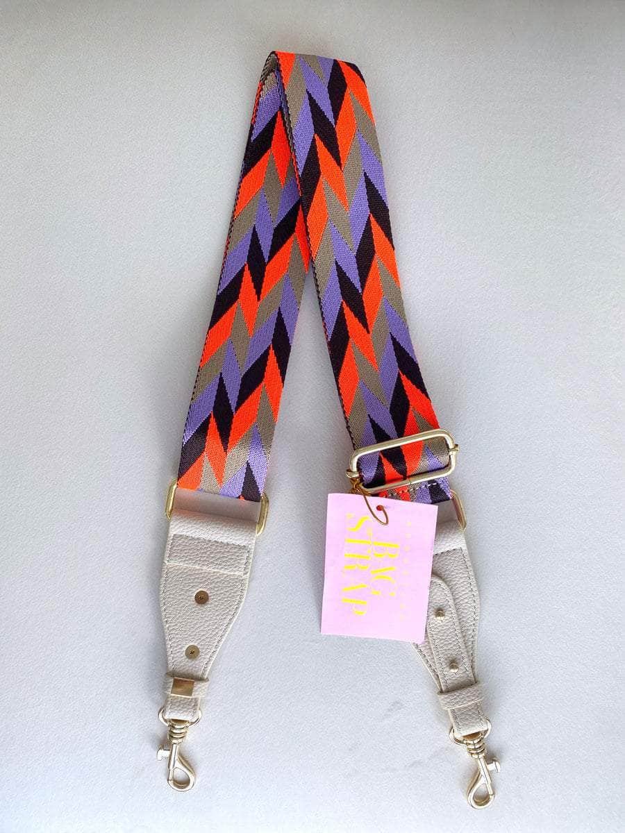 A orange and purple abstract adjustable woven bag strap with faux leather, and gold hardware clasps
